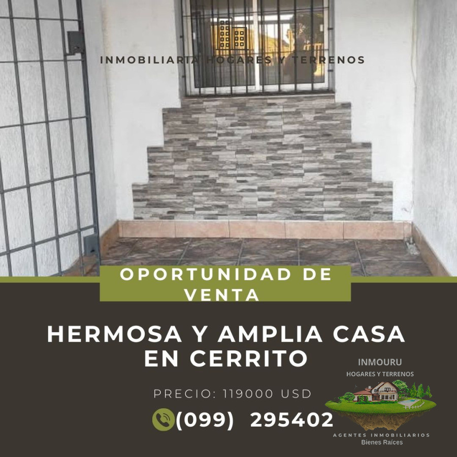 Vendo Amplia Casa ubicada en Cerrito en la calle Joaquín Artigas y Hum, al frente , cuenta con tres dormitorios amplios, living comedor, cocina defina, baño, patio con parrillero garaje con lugar para auto. (agua y luz independiente). Se encuentra alquilada.
